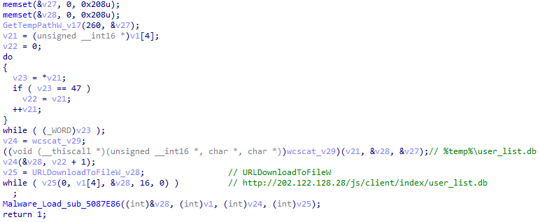 "svchost.exe" 프로세스에 삽입된 쉘 코드는 추가 악성코드를 %TEMP% 경로에 다운로드하며 이를 실행한다. 확인된 다운로드 주소는 아래와 같다.