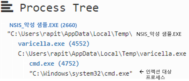 정리하자면 NSIS 악성 샘플을 실행 시 Dll_Loader(varicella.exe)로 DLL을 로드하며, DLL을 통해 로드된 바이너리의 쉘코드가 cmd.exe(or MSBuild.exe)에 인젝션하여 악성 행위가 발현된다.