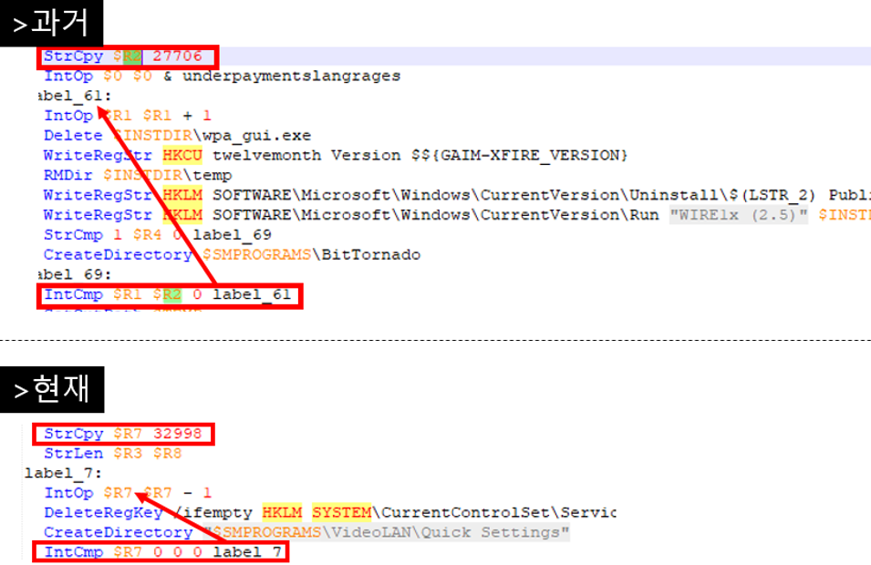 과거와 동일하게 현재도 시간 지연 코드를 가지고 있다. 위 [그림 2]의 하단 샘플로 예시를 들자면 디렉토리나 레지스트리 키에 접근하는 무의미한 행위를 $R7이 0이 될 때까지 32,998번을 반복 후 악성코드에 필요한 파일을 생성한다.