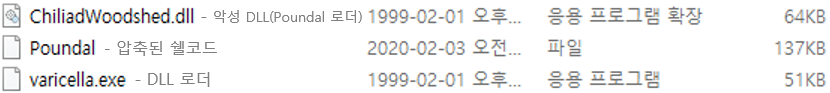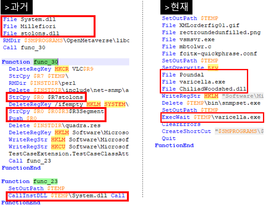 과거에는 CallInstDLL(system.dll의 call)을 이용해 악성 DLL의 Export 함수를 실행하는 반면 최근에는 ExecWait을 통해 특정 실행 파일(varicella.exe)을 실행한다. 이 "varicella.exe"는 악성 DLL(ChiliadWoodshed.dll)의 Export 함수를 실행하는 용도로 즉, 로더 역할이었던 "System.dll"이 "varicella.exe"로 바뀐 샘이다. 참고로 "varicella.exe"의 파일명은 악성샘플마다 다양한 형태로 변경되어 배포 중이다.