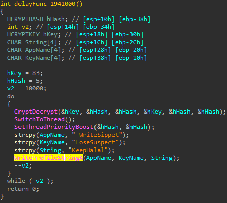 복호화된 쉘코드 내부에도 시간 지연 코드가 존재한다. 해당 코드는 WriteProfileStringA API를 이용해 %WINDIR%win.ini파일에 10,000번 접근하는 것으로 WriteProfileStringA API는 프로세스가 관리자 권한 이상인 경우에만 win.ini에 접근할 수 있기 때문에 일반적인 사용자 PC에서는 시간 지연은 미비하다.