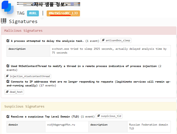 자사 동적 머신인 RAPIT의 결과([그림 7.] 참조)를 확인해보면 악성코드는 해당 기법 이후에 svchost.exe에 인젝션 및 시간 지연 기능이 있으며, 특정 C2서버와 통신하는 NetWiredRC Backdoor인 것을 확인할 수 있다.