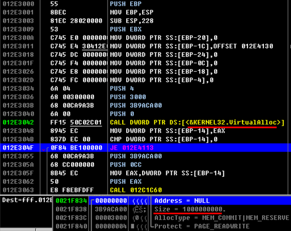 해당 기법은 VirtualAlloc() API를 이용해 0x3B9AC00(대략 1GB)만큼의 메모리를 할당한다. 만약 해당 크기를 할당하지 못하면 잘못된 주소를 참조하게 만들어 강제로 Crash를 발생시킨다.