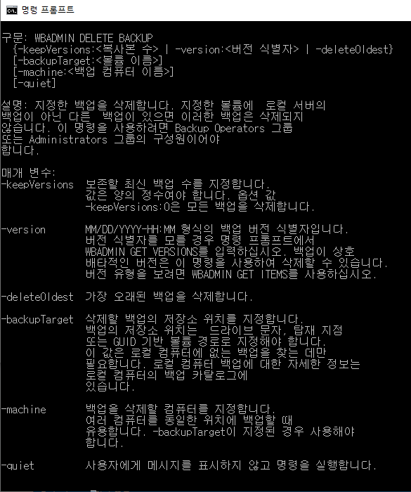 - wbadmin.exe delete systemstatebackup -keepVersions:0 -quiet -> 시스템 상태 백업을 0개 남기고 모두 삭제