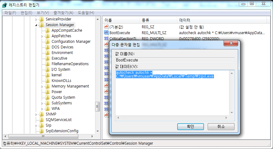 부팅 시 윈도우 서비스를 로드하기 전 실행을 위해 아래의 레지스트리 경로의 BootExecute에 자기자신을 등록 한다.