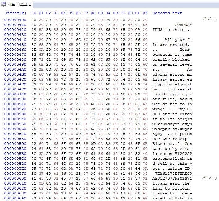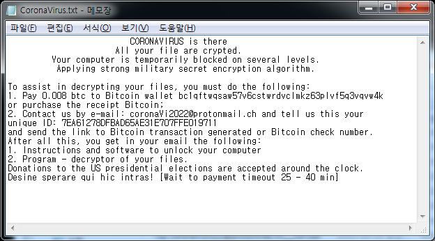 ASEC 분석팀은 감염 시, CoronaVirus.txt 이름의 랜섬노트를 생성하는 랜섬웨어가 국내에 유포 중인 것을 확인하였다. 아래의 그림에서 알 수 있듯이 암호화된 사용자의 파일의 복구를 댓가로 비트코인 지불(0.008 btc: 50$)을 요구한다. 지불을 위한 제작자와의 통신은 이메일을 통해 이루어지며, coronaVi2022@protonmail.ch 로 확인되었다. 랜섬노트 마지막의 "desine sperare qui hic intras"는 라틴어로 "여기에서 우리는 희망을 포기"라는 의미이다.