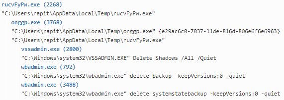 일반적인 랜섬웨어에서는 윈도우 복원기능을 통한 백업을 수행하지 못하도록 vssadmin.exe를 이용한 볼륨섀도 복사본을 삭제하는 기능이 존재한다. 하지만, 이 랜섬웨어는 추가로 wbadmin.exe를 이용하여 시스템 백업까지 삭제하는 것이 특징이다. wbadmin.exe 파일은 vssadmin.exe 와 마찬가지로 윈도우 시스템 제공 정상파일이며 워너크라이 랜섬웨어에서도 사용된 적이 있다. (wbadmin delete catalog -quiet)