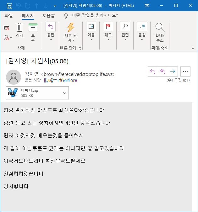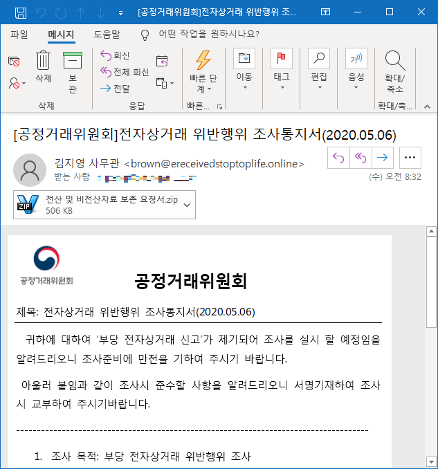 ASEC 분석팀은 5월 6일 이력서와 공정거래위원회를 사칭한 악성코드가 다수 유포됨을 확인하였다. 해당 악성코드는 첨부파일 형태로 유포되는 악성코드이며 하나의 압축파일에 파일명은 유사하지만, 성격이 다른 악성코드들이 포함되어 함께 유포되었다.
