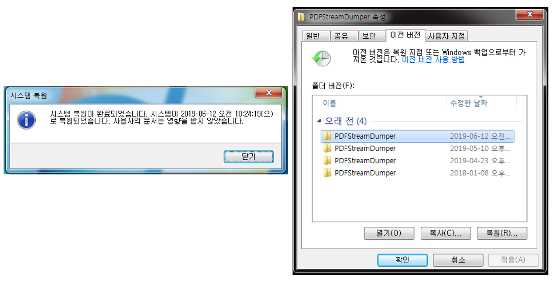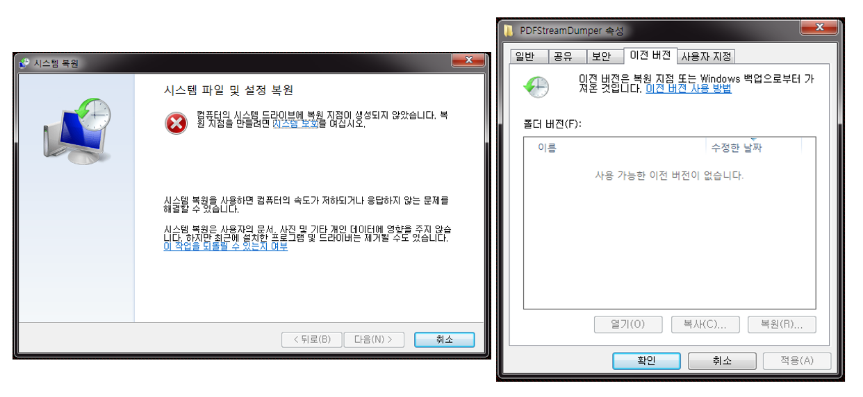 아래 그림은 이전 Nemty 에서 볼륨 쉐도우가 삭제되어 시스템 복원 및 파일 복구가 불가능한 모습이다.