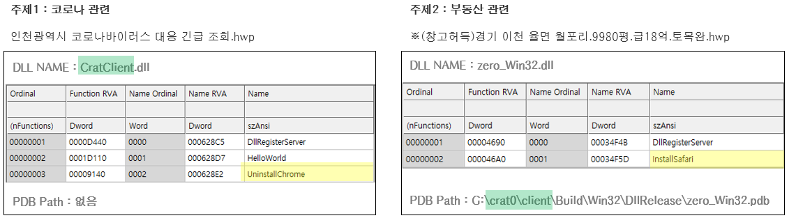 주제1, 주제2의 대표 파일에서 다운로드 된 DLL의 유사성이 위와 같이 확인된다. 두 파일은 특정 Export함수 실행을 통해 주요 악성 행위를 하는데 이때 함수명을 특정 인스톨러 설치 파일에서 쓰일 법한 이름을 사용하는 것을 알 수 있다. 또한 주제1의 DLL에서 사용한 DLL 이름명을 주제2의 PDB 경로로 사용한 것이 확인 가능하다.