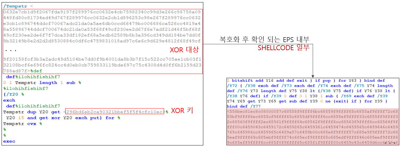 해당 세 파일들은 모두 아래와 같은 구조의 EPS를 가지며 XOR 인코딩 된 쉘코드가 메모리 상에서 동작하여 추가 악성 파일을 다운로드한다. 다운받아지는 악성 파일명은 'vbs.txt'와 'no1.txt'이며 최종적으로 사용자 정보를 전송하며 추가 악성 파일을 다운로드 할 수 있다. 위 주제 1,2,3의 한글 EPS는 VBS를 생성하여 해당 파일이 추가 악성코드를 다운로드 하였으나 이 코니 류는 다운로드를 수행하는 쉘코드가 파일로 생성되지 않고 메모리상에서 동작한다는 차이가 있다.