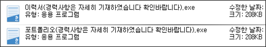 최근 활발히 유포 중인 이력서를 위장한 악성코드 또한 마찬가지이다. 기존에는 V3 진단명 "MalPE"유형의 패커(Packer)를 사용하였지만 최근 발견된 샘플에서는 NSIS를 사용한다. 아이콘 및 파일명은 기존과 동일하다.
