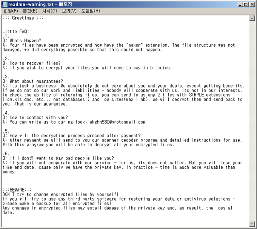 본 샘플에서 최종적으로 실행되는 바이너리는 Makop랜섬웨어로, 기존 MalPe 유형으로 활발히 유포된 바 있다.