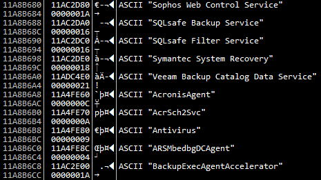 그리고 다수의 서비스, 프로세스들을 종료시킨다. 종료 대상 목록으로는 Adobe, MSSQl, MSExchange 등의 정상 프로그램들 뿐만 아니라 다수의 보안 프로그램들도 그 대상이 된다.