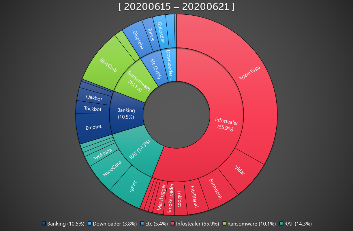ASEC 분석팀에서는 ASEC 자동 분석 시스템 RAPIT를 활용하여 알려진 악성코드들에 대한 분류 및 대응을 진행하고 있다. 여기에서는 2020년 6월15일 월요일부터 2020년 6월 21일 일요일까지 수집된 한 주간의 통계를 정리한다.