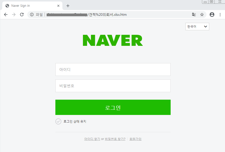 첨부된 파일(HTML)을 실행시 아래와 같이 국내 유명 포털 사이트의 로그인 화면을 확인할 수 있다. 피싱 페이지는 정상 로그인 페이지와 매우 유사하여 사용자들은 큰 의심없이 로그인 시도를 할 수 있으며, 계정 정보를 입력 후 로그인을 진행하게 되면 아래 서버로 정보가 유출된다.