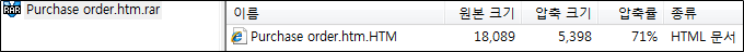 각 메일에는 "견적 의뢰서.xlsx.htm", "Purchase order.htm.rar" 명으로 파일이 첨부되어 있다. 파일명에 .xlsx 을 추가하여 엑셀 파일로 위장하고 있으며 rar 파일은 압축 해제시 내부에 악성 html 파일이 존재한다.