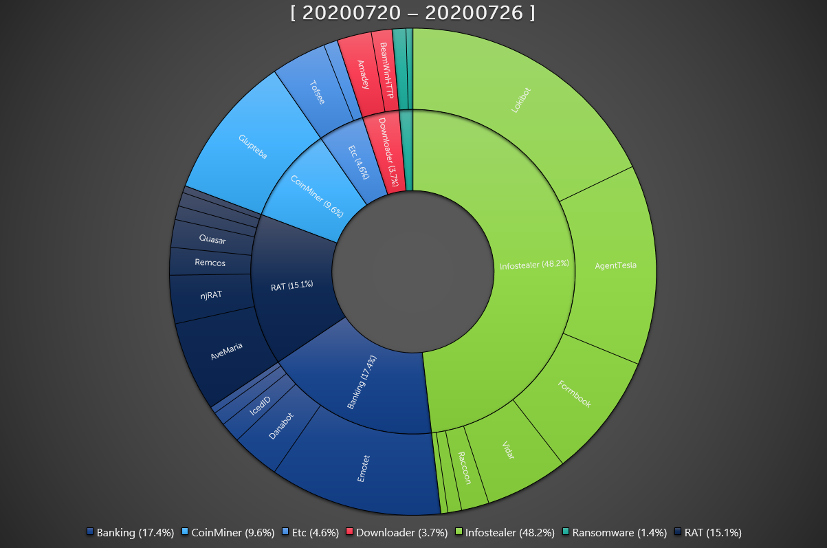 ASEC 분석팀에서는 ASEC 자동 분석 시스템 RAPIT를 활용하여 알려진 악성코드들에 대한 분류 및 대응을 진행하고 있다. 여기에서는 2020년 7월 20일 월요일부터 2020년 7월 26일 일요일까지 수집된 한 주간의 통계를 정리한다.
