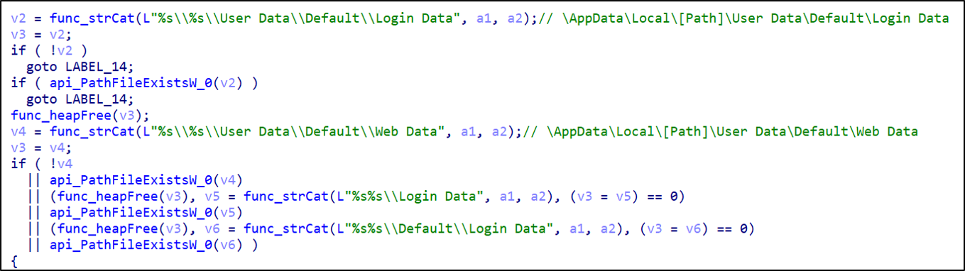 먼저 \AppData\Local\Google\Chrome\User Data\Default\Login Data 파일의 존재 유무를 확인하고, 존재하지 않을 시에는 Web Data 파일을 확인한다. 이는 과거 Chromium 버전에서 계정 정보가 Web Data 파일에 저장되었기 때문에 Login Data 먼저 검사한 후 이 파일이 존재하지 않으면 과거 버전으로 여기고 Web Data 파일을 읽기 위한 것으로 보인다. 참고로 다른 Chromium 기반 웹 브라우저들 마다 경로가 조금씩 다를 수 있기 때문에 위의 경로 외에도 몇 개의 경로를 더 검사한다.
