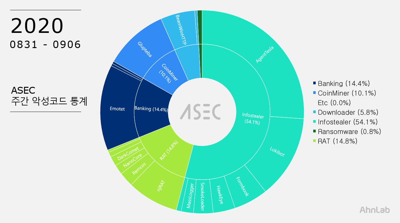 ASEC 분석팀에서는 ASEC 자동 분석 시스템 RAPIT를 활용하여 알려진 악성코드들에 대한 분류 및 대응을 진행하고 있다. 여기에서는 2020년 8월 31일 월요일부터 2020년 9월 6일 일요일까지 수집된 한 주간의 통계를 정리한다.