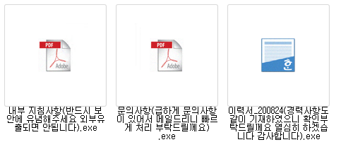 해당 랜섬웨어는 여전히 이메일 형태로 유포되고 있으며 HWP, PDF와 같은 문서 형태의 실행 파일(.exe) 아이콘으로 위장하고 있다.