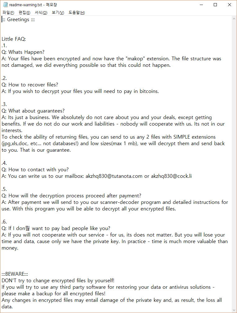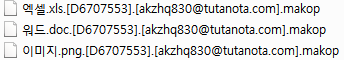 감염 시 원본파일명.[랜덤8자].[akzhq830@tutanota.com].makop 로 파일명이 변경된다.
