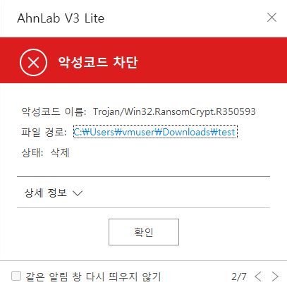 안랩 V3 제품군에서는 위 유형의 악성코드를 다음과 같이 탐지하고 있다.