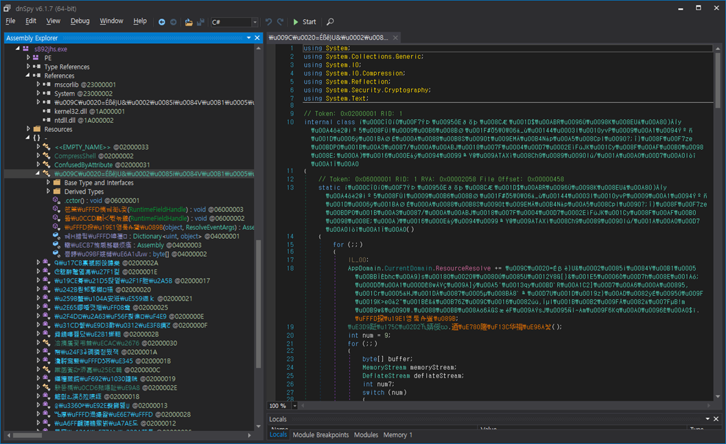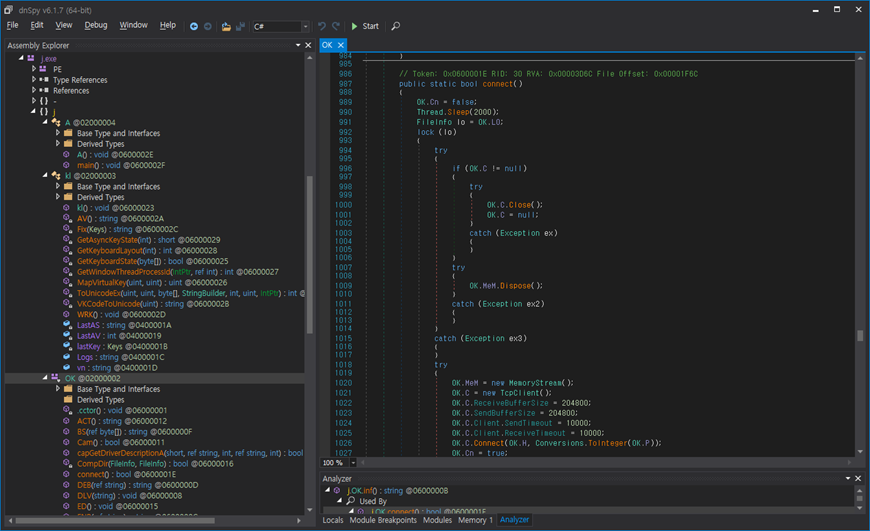 패커를 풀어낼 시 아래와 같이 원본 코드를 확인할 수 있으며, 이는 흔히 알려진 ‘NjRat’ 중 0.7d 버전 코드와 동일하다.