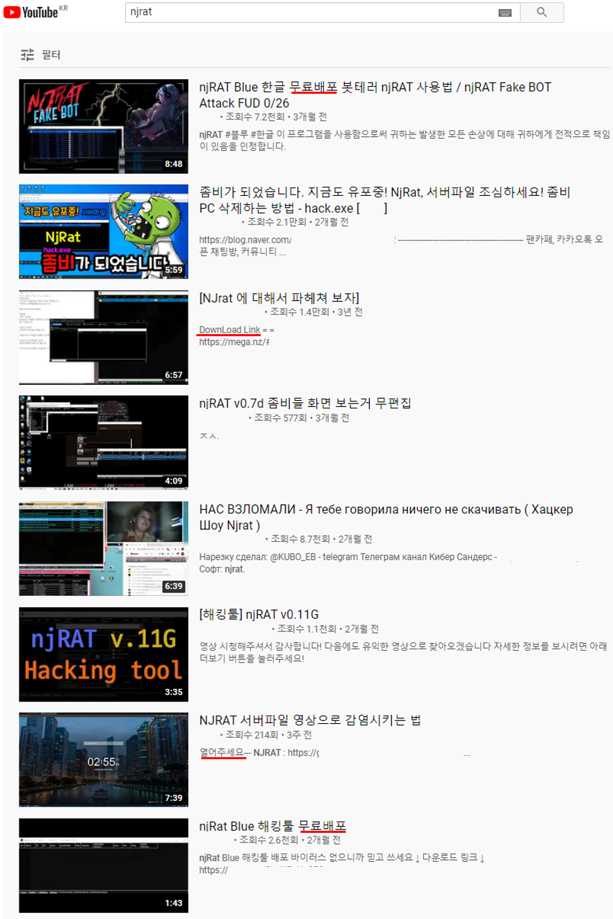 국내에선 RAT류를 흔히 ‘섭파’(서버파일)라 불리는 것으로 보이며, 그 중 NjRat은 이미 잘 알려진 악성코드로 쉽게 접할 수 있고 유포 및 악용할 소지가 있어 사용자들의 주의가 필요하다. 잘 알려진 동영상 공유 플랫폼 ‘YouTube’에서도 해당 컨텐츠는 쉽게 찾아볼 수 있다.