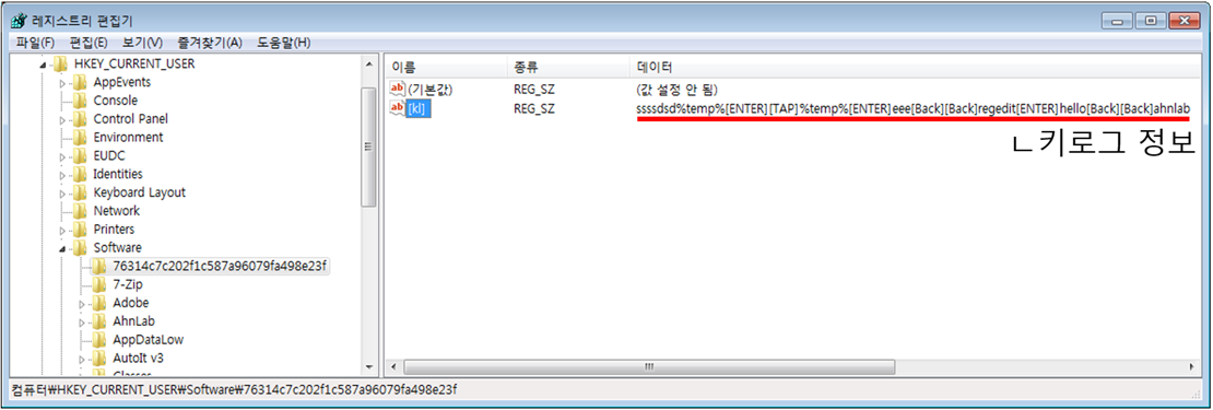 NjRat 악성코드의 특징은 디폴트 설정 시 키로그 정보를 특정 레지스트리에 ‘[kl]’ 이름으로 저장하고 공격자에게 유출한다.