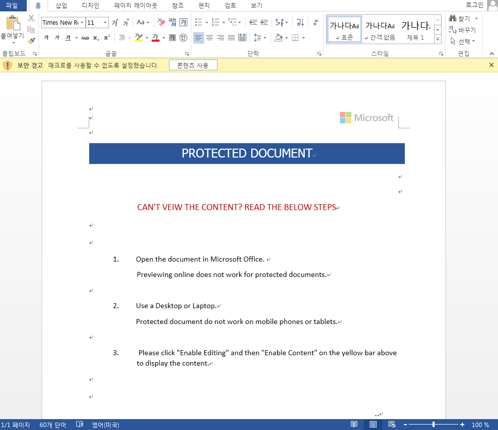 악성 매크로가 포함된 문서를 실행하게 되면, 아래와 같은 문구를 통해 사용자의 호기심을 유발한다. 문구에는 보호된 콘텐츠를 보기 위해 아래 동작을 수행하라는 내용을 포함하고 있으며, 매크로 사용 버튼을 클릭하도록 유도하고 있다. 또한 문구 내용 중 휴대폰이나 태블릿에서는 보호된 문서를 볼 수 없기 때문에 데스크탑이나 노트북에서 사용하도록 유도하여 악성코드가 정상적으로 동작할 수 있도록 한다.