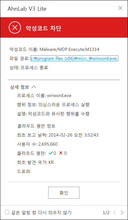 현재 V3 제품에서는 관련 파일에 대하여 다음과 같이 진단하고 있다.