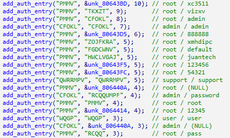 두 번째 전파 방식은 Mirai의 코드에서 가져온 사전 공격이다. 다른 악성코드에서 코드를 가져왔을 뿐이지 기능 자체는 Gafgyt의 사전 공격과 동일하다. 차이점이 있다면 Mirai와 같이 계정 정보를 인코딩해서 가지고 있다가 디코딩해서 사용한다는 점이 있다. Report 서버 또한 동일하다.