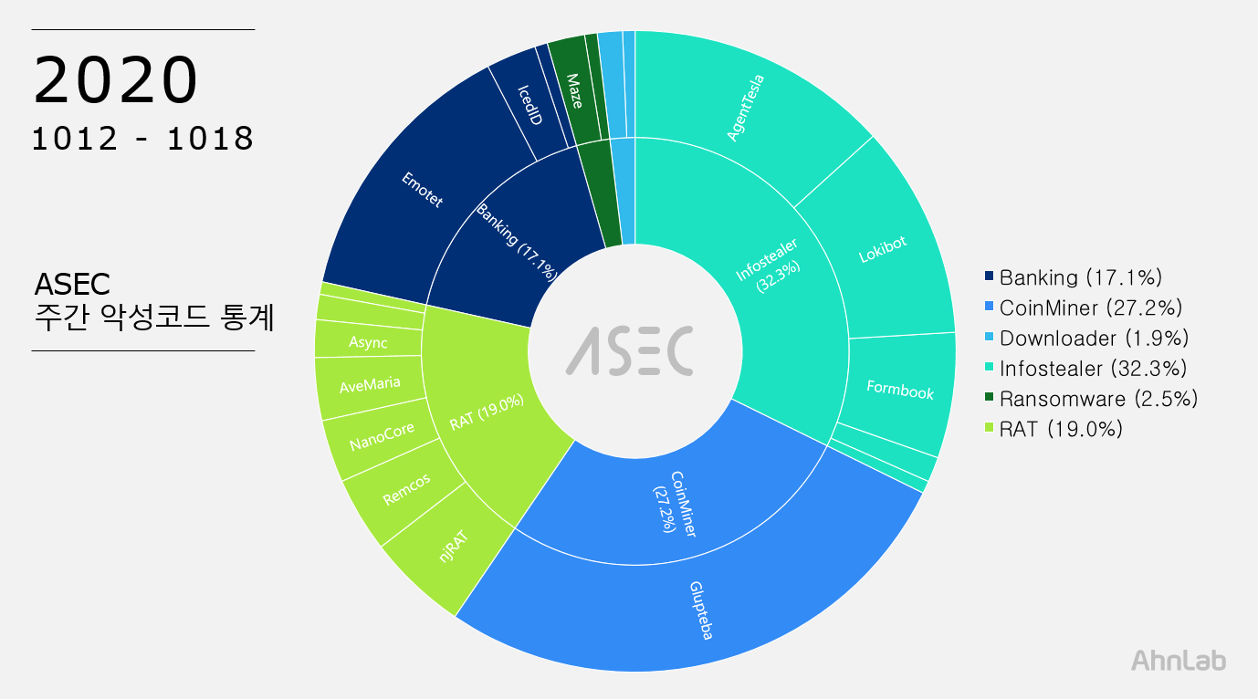 ASEC 분석팀에서는 ASEC 자동 분석 시스템 RAPIT를 활용하여 알려진 악성코드들에 대한 분류 및 대응을 진행하고 있다. 여기에서는 2020년 10월 12일 월요일부터 2020년 10월 18일 일요일까지 수집된 한 주간의 통계를 정리한다.