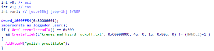 최종적으로 로드되는 DLL에서는 다음과 같이 특정 유명 해외 분석가(kremez, Hasherezade)를 모욕하는 문자열이 포함되어 있다. 악성 행위와는 관련이 없는 코드이기 때문에 공격자가 메시지를 전달하기 위해 의도적으로 추가했을 것으로 판단된다.