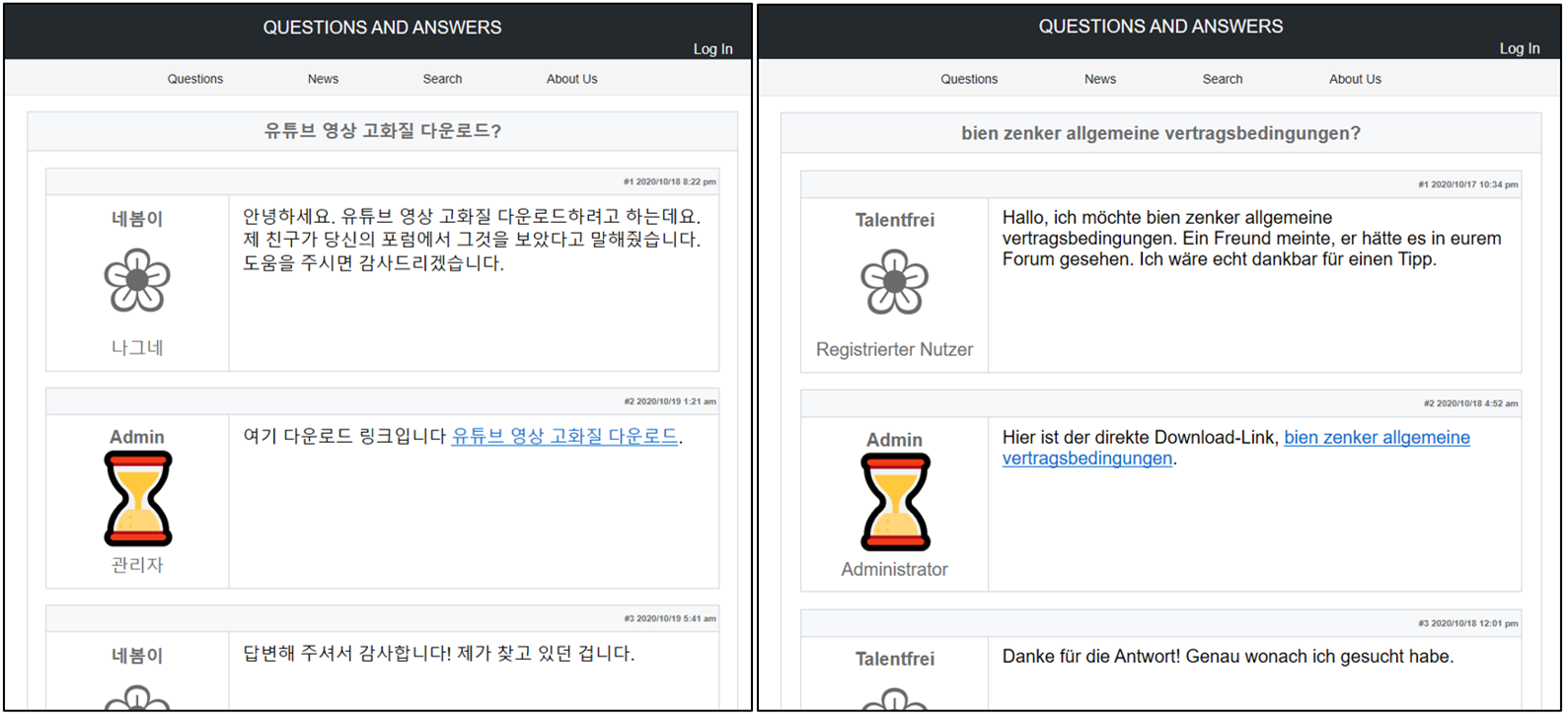 ASEC 분석팀은 JS형태로 유포되는 BlueCrab 랜섬웨어의 감염 과정에서 큰 변형이 발생한 것을 확인하여 관련 내용을 공유하고자 한다. JS.BlueCrab 랜섬웨어는 다운로드 페이지를 위장한 피싱 페이지로부터 유포된다. 공격자는 취약한 워드프레스 환경의 웹 서버를 탈취하여 다수의 악성 게시글을 업로드 하며 해당 악성 게시글에 접속 시 다음과 같이 다운로드 페이지로 위장한 피싱 페이지가 출력된다. 각 게시글마다 키워드를 다르게 하여 사용자의 악성코드 다운로드를 유도한다. 모니터링 과정에서 다음 그림처럼 외국어(독일어)로 된 피싱 페이지도 존재하는 것을 확인했다.