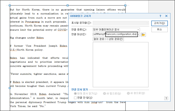 문서 내부 페이지의 글들은 글 상자 개체로 존재하며 각 개체의 속성 제거 시 아래와 같이 악성 VBS 파일로의 하이퍼링크가 존재한다. 해당 하이퍼링크는 상대경로인 "..\appdata\local\temp\hancom.configuration.vbs"로 설정되어 있다. 따라서 이전 악성 한글 문서와 동일하게 한글 문서가 "C:\Users\[사용자]" 경로 하위 폴더에 존재해야만 악성 VBS 파일이 실행될 수 있다.