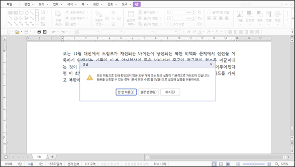 만약 한글 보안패치가 최신으로 적용되어 있다면, 다음과 같은 알림창이 생성된 후에 사용자가 허용을 클릭하여야만 악성 행위가 발현된다.