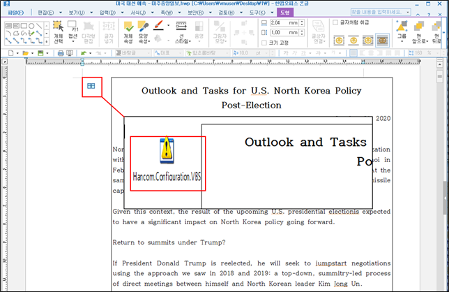 ASEC 분석팀은 악성 OLE 개체를 포함하고 있는 한글 문서가 유포 중임을 확인하였다. 문서 파일에는 미국의 대선 및 북한 관련 내용이 존재하며 이전 링크 개체를 이용한 악성 한글 문서와 유사한 특징을 지니고 있다.